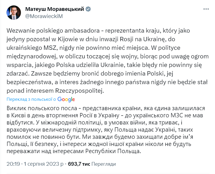 Премьер-министр Польши Матеуш Моравецкий прокомментировал вызов польского посла в Министерство иностранных дел Украины. Этому предшествовало заявление представителя Офиса Президента Польши Марчина Пшидача, что Украине следует ценить поддержку Польши в войне против России.