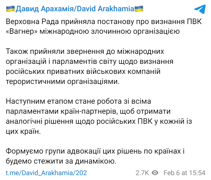 "Верховна Рада прийняла постанову про визнання ПВК "Вагнера" міжнародною злочинною організацією", — повідомив Арахамія.