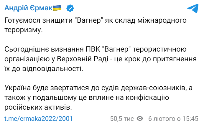 "Готуємося знищити "Вагнер" як складову міжнародного тероризму. Сьогоднішнє визнання ПВК "Вагнер" терористичною організацією у Верховній Раді — це крок до притягнення їх до відповідальності", — написав Єрмак у своєму Telegram.