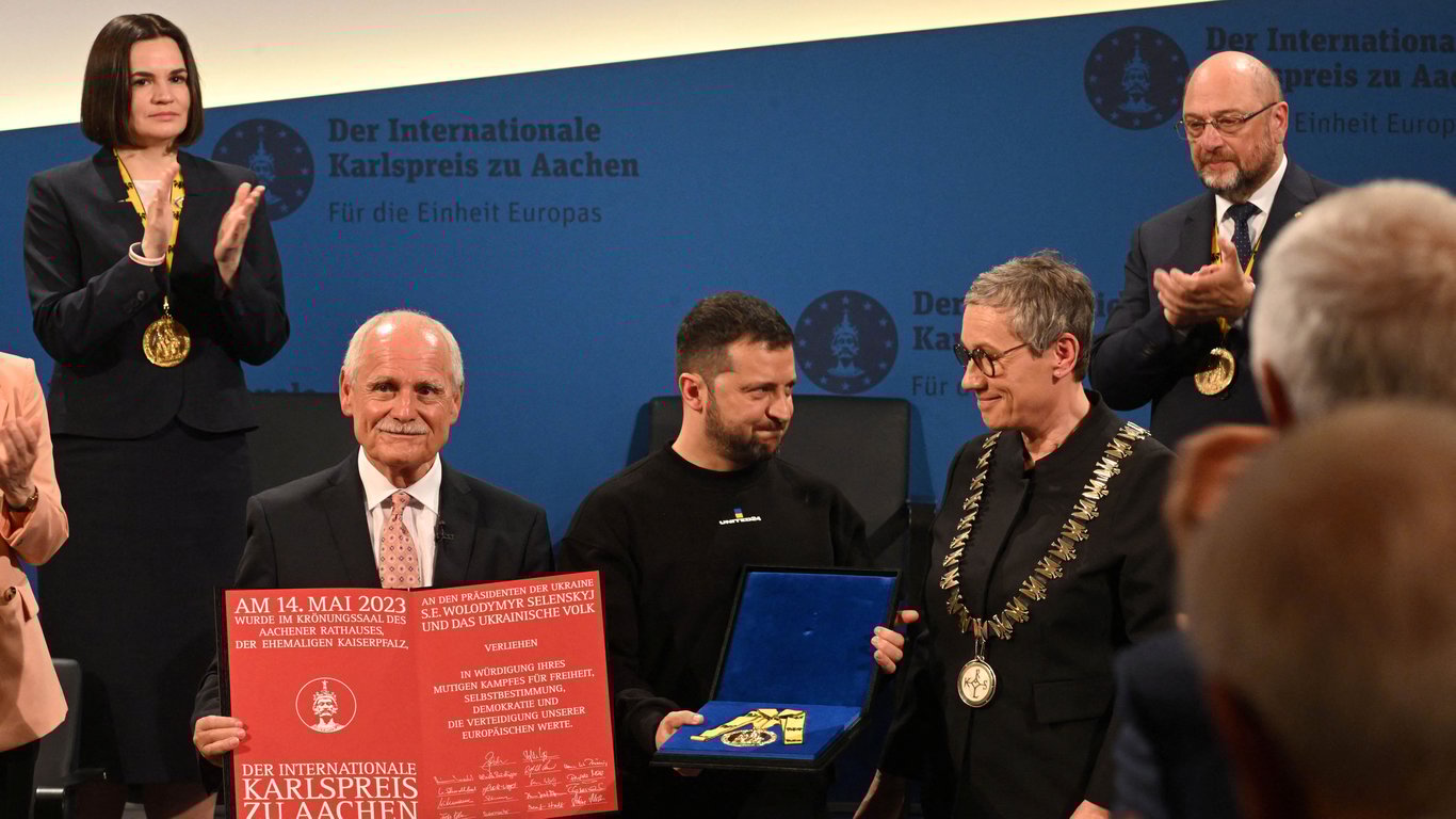 Сьогодні, 14 травня, Президент України Володимир Зеленський отримав премію Карла Великого у Німеччині. На врученні нагороди він зустрівся з білоруською опозиціонеркою Світланою Тихановською.
